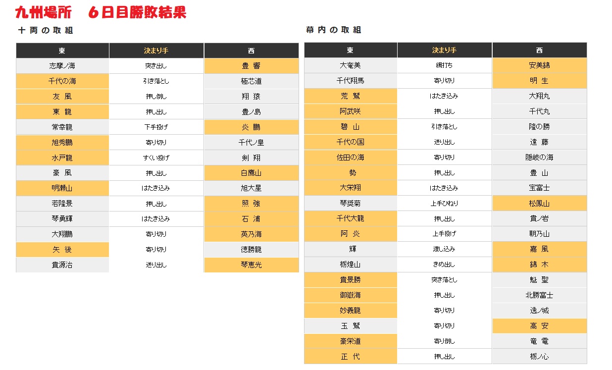 勝ちっ放しの貴景勝と栃煌山を1敗で高安、平幕の千代大龍・阿炎・阿武咲ら6人が追う展開。