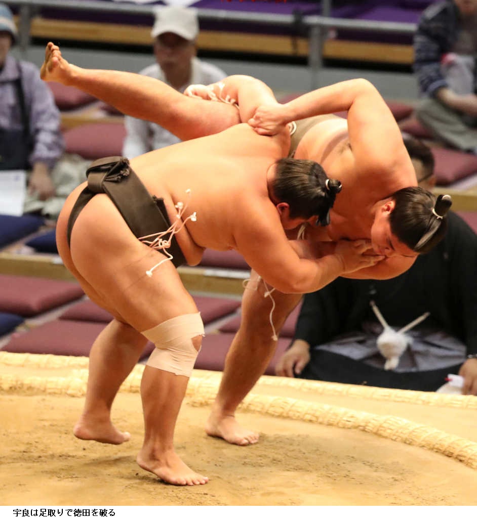 宇良 「足取り」で無傷の3連勝!久しぶりに“業師”らしい姿 ―― これぞ、という足取りだ。東三段目33枚目の宇良(26=木瀬部屋)が無傷の3連勝を飾り、勝ち越しに王手をかけた。長身の徳田の下にもぐると、すかさず右足をとって持ち上げ、豪快に土俵の外へ放り投げた。