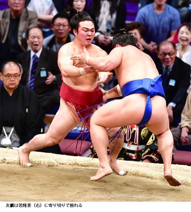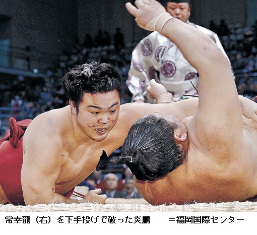 炎鵬は西十両12枚目の常幸龍(木瀬部屋)と対戦。懐に潜り込むと相手の右上手投げをこらえた後、豪快な左下手投げを決めた。5日目に初黒星を喫したが連敗はせず「気持ちを切り替えられた。我慢してから、得意の下手投げがうまくいった」とほほ笑んだ。