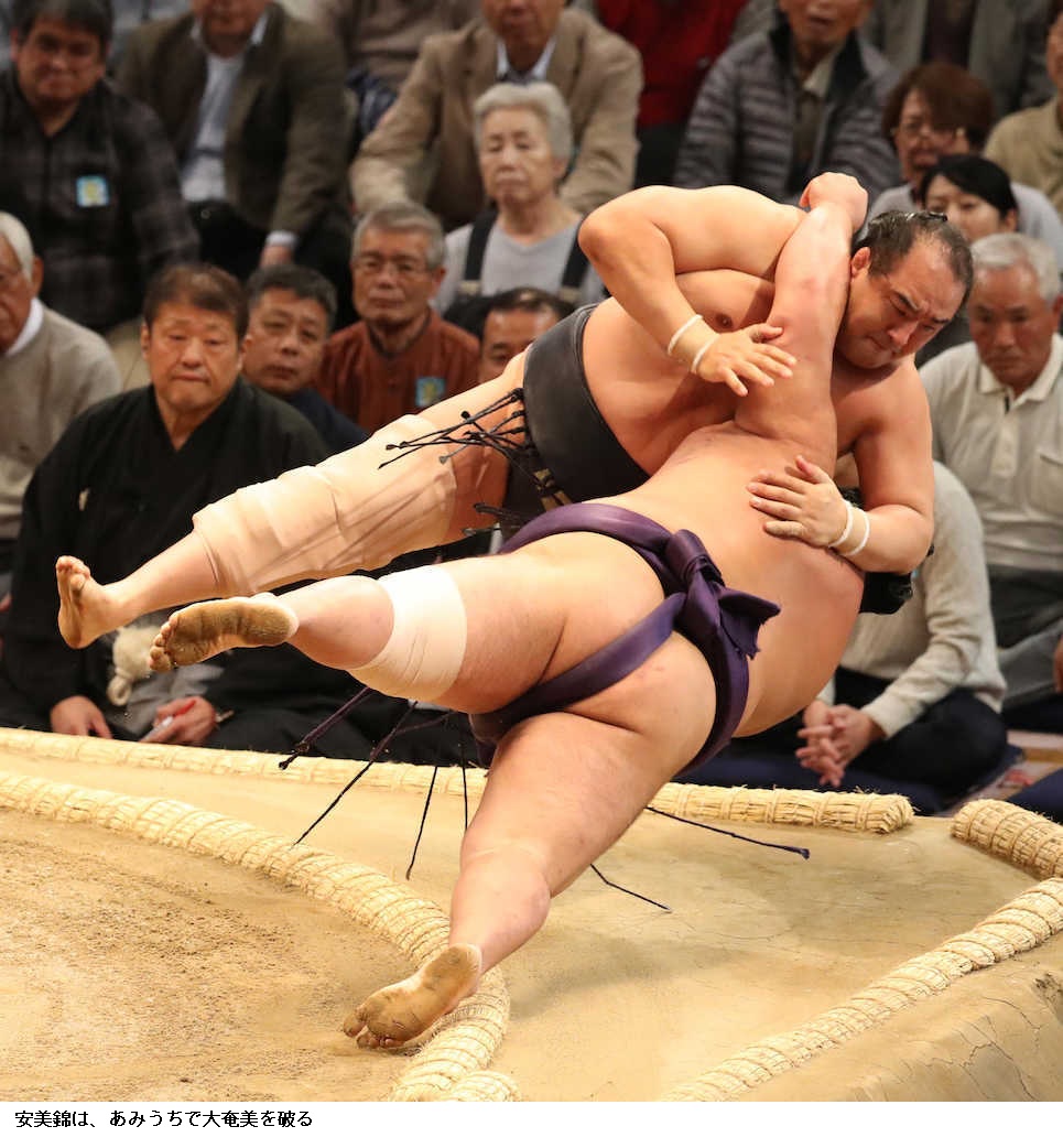 安美錦 初の網打ち披露「アミニシキだけにアミウチ。それを言いたかった」自身44手目 ―― 関取最年長40歳の西十両2枚目・安美錦(伊勢ケ浜部屋)が幕内の土俵で東前頭15枚目・大奄美(25=追手風部屋)と対戦し、土俵際の網打ちで3勝目を挙げた。