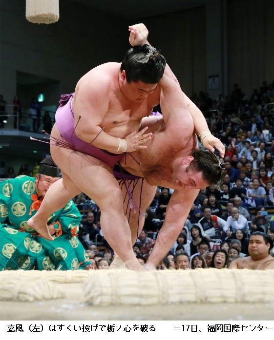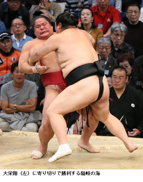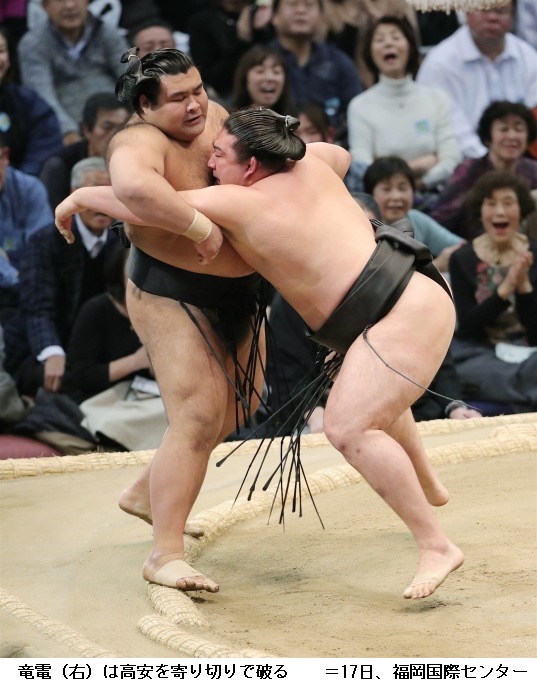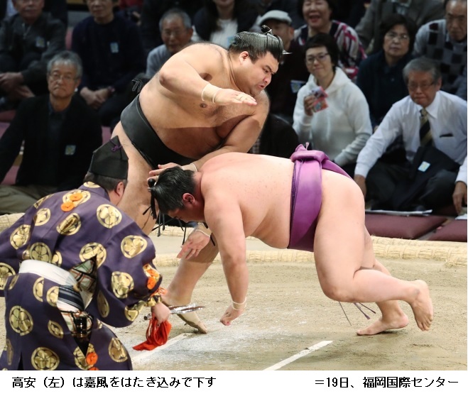 他の大関陣は高安が平幕嘉風をはたき込んで7勝目、豪栄道は平幕千代大龍を引き落として6勝目を挙げた。