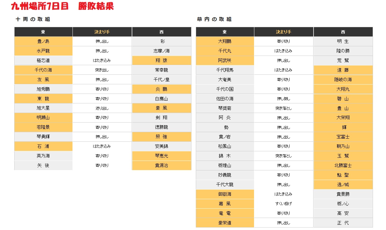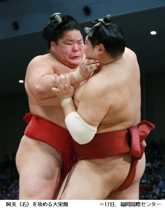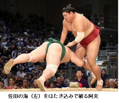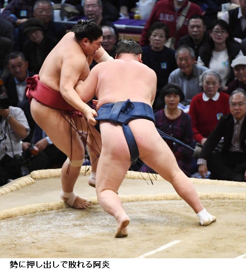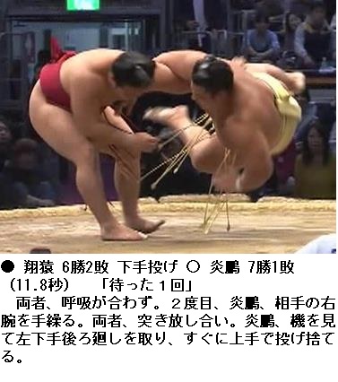 1敗同士、炎鵬と翔猿が直接対戦。炎鵬が素早い下手投げで倒し、7勝目を上げる。