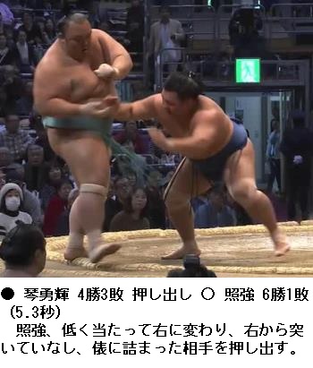 「ちょっと出遅れました」と言いながらも態勢を立て直し突っ張って反撃。徐々に相手を押し込む。左からいなされつんのめるが、すぐに持ち直し最後は左からの一発で押し倒した。