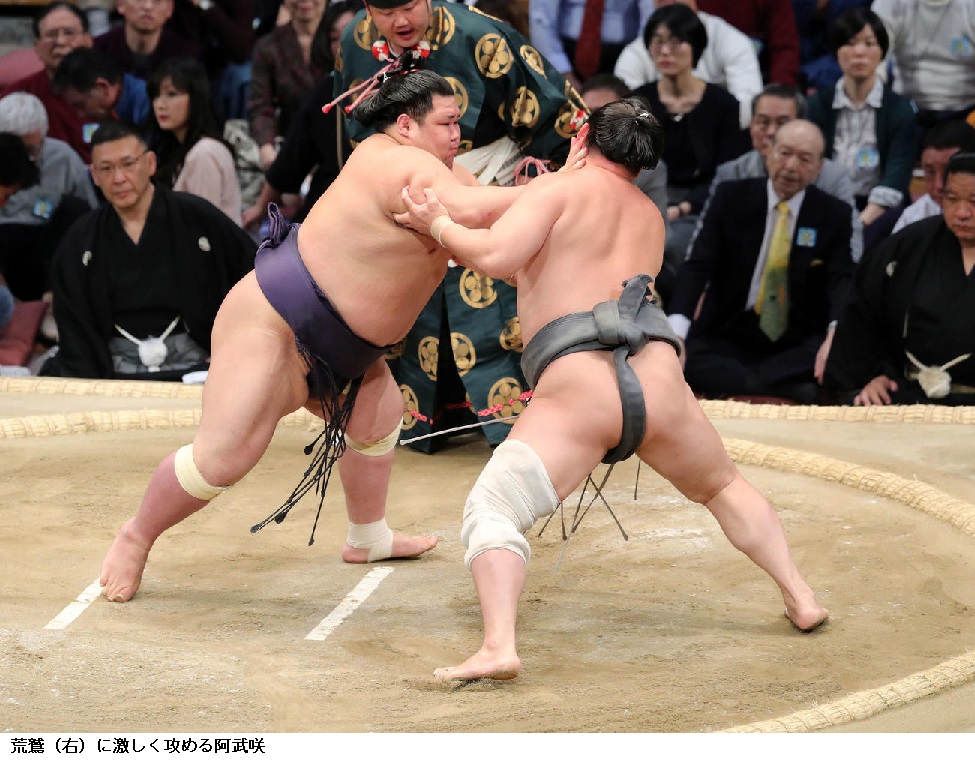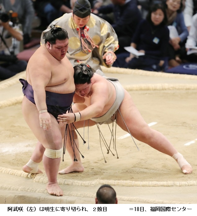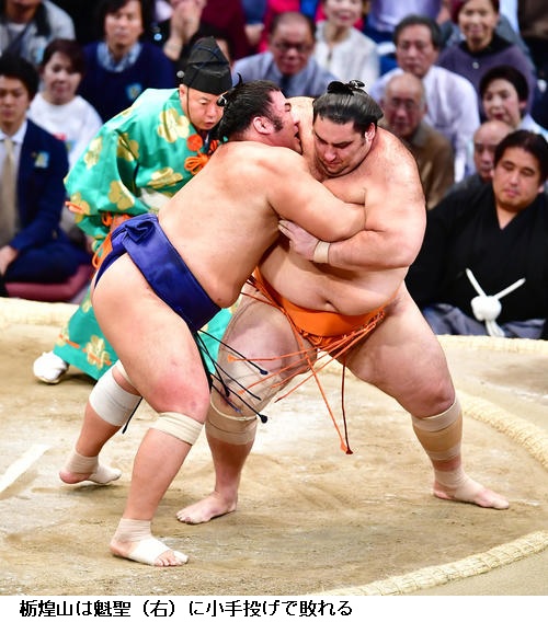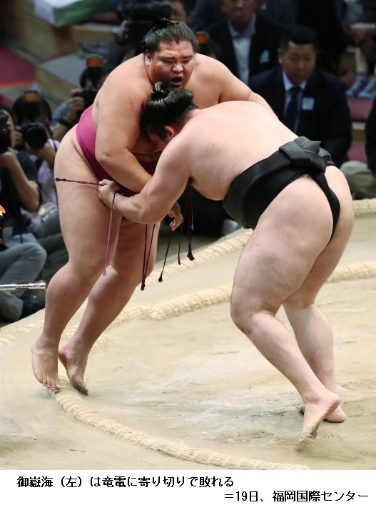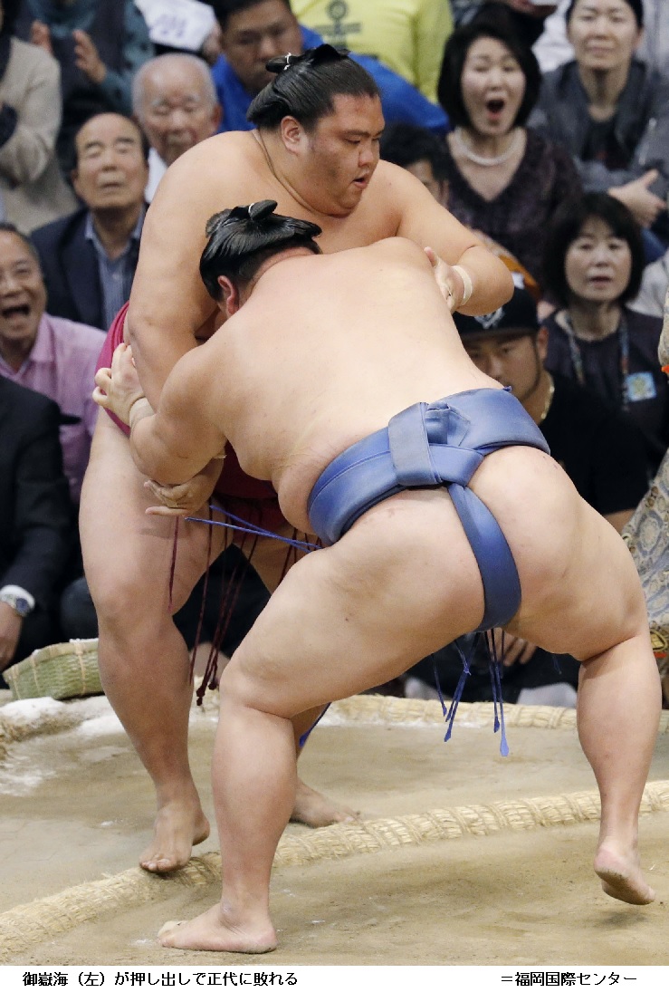 成績次第で大関昇進の可能性がある関脇御嶽海は小結魁聖に寄り切られ、2連敗で手痛い3敗目。