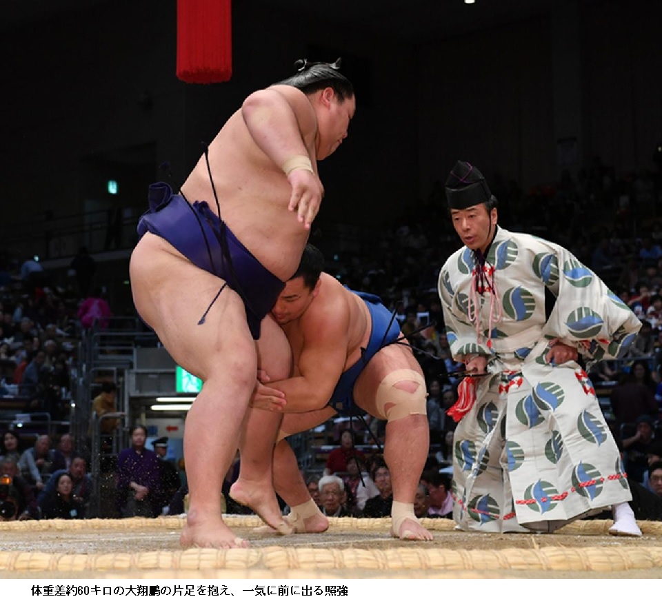 もう一人の1敗力士 照強は、大翔鵬と対戦。猫だましからの足取りで土俵外に出し、7勝目。炎鵬と二人でトップに並ぶ。