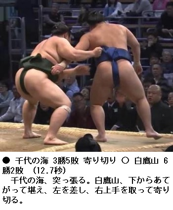 2敗の白鷹山は、千代の海を寄り切って6勝目。翔猿と二人でトップと1差。