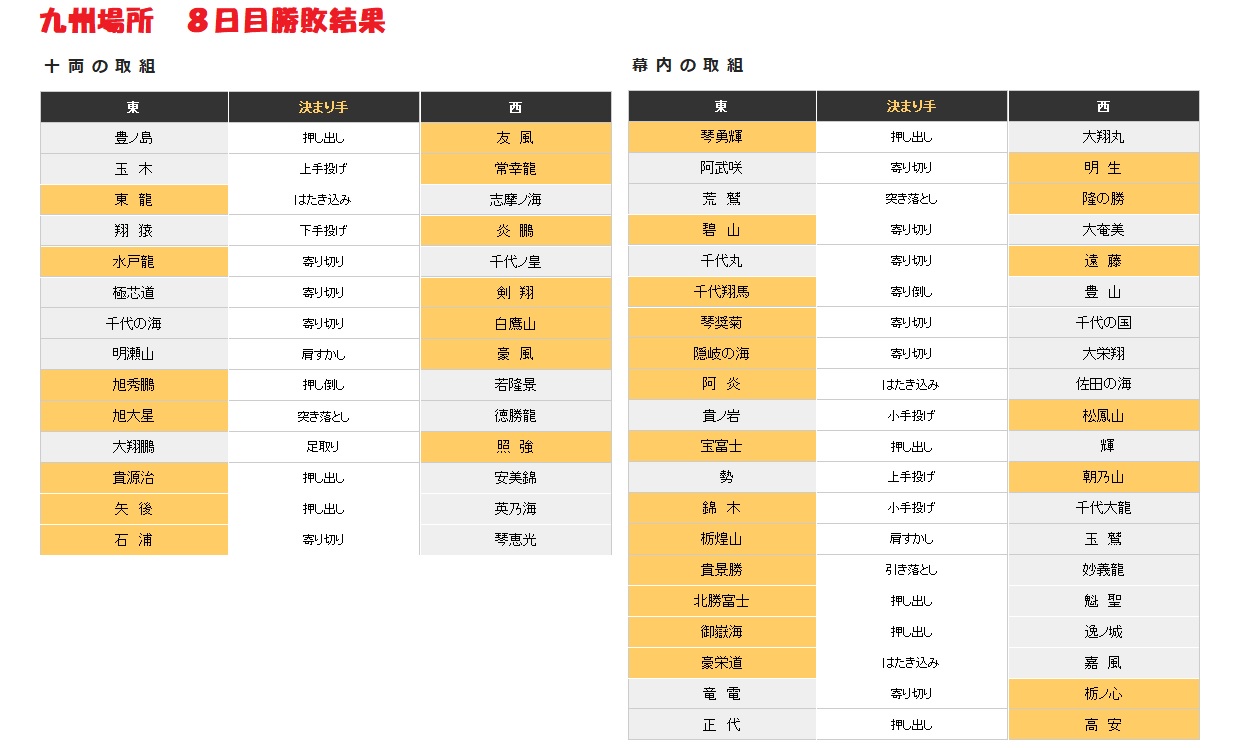 貴景勝を追う2敗は高安、大栄翔、碧山、阿武咲の4人となった。