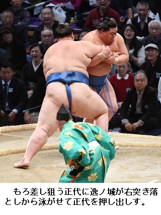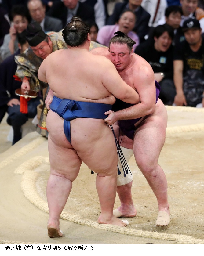 栃ノ心は関脇逸ノ城を寄り切って星を五分に戻した。逸ノ城は7敗目。