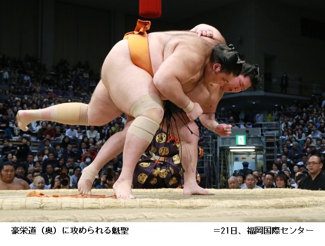豪栄道は小結魁聖を寄り倒して、勝ち越した。