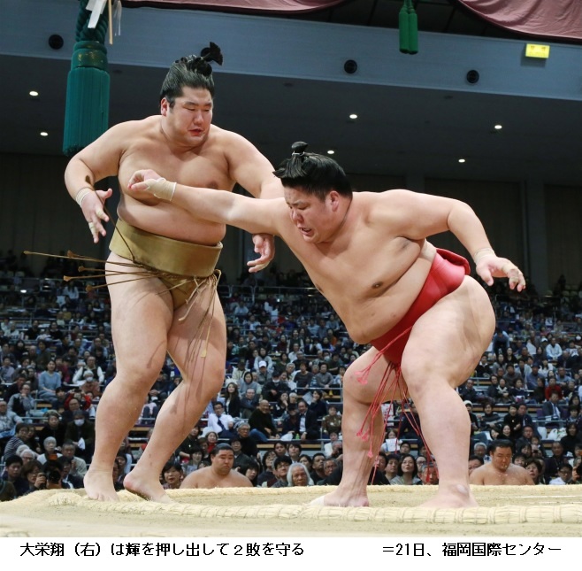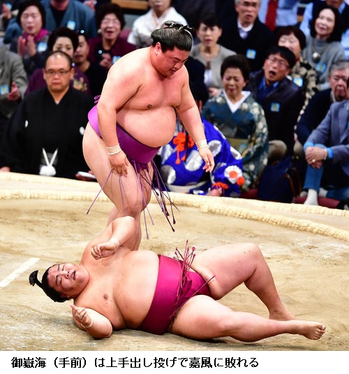 輝は西前頭4枚目の嘉風(尾車部屋)に右おっつけ、左喉輪で土俵際へ攻め込むも腰が高い。嘉風にもろ差しを許して後退し、左で渡し込まれて残せなかった。「ちょっと焦った。だんだん上体に力が入って、攻め切れなかった」と反省した。