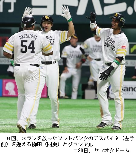 3回、上林の2ランで先制。1点差とされた4回にデスパイネのソロ、6回には代打長谷川勇の適時打で加点した。東浜は制球良く5回1失点。救援陣が無失点でつなぎ、森が2戦連続でセーブを挙げた。