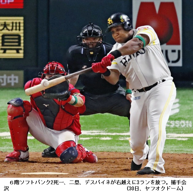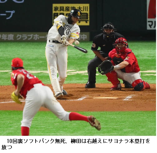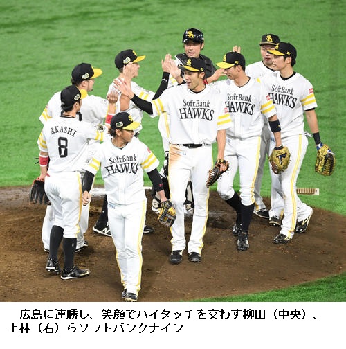 ソフトバンクは四回、中村晃と今宮の適時打で2点先制。その後も柳田の適時内野安打、デスパイネの3ランなどで効率良く加点した。広島は鈴木と安部がともに2本塁打を放って反撃したが、あと一歩及ばなかった。
