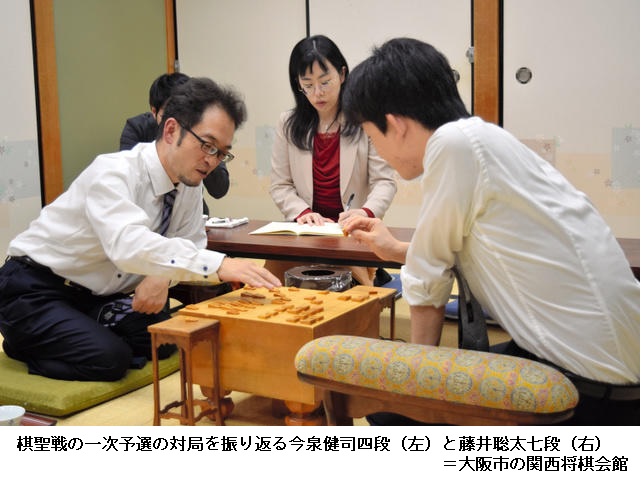 藤井七段、棋聖戦の一次予選突破 今泉四段に雪辱果たす ―― 将棋の高校生棋士、藤井聡太七段(16)が31日、大阪市福島区の関西将棋会館で、第90期棋聖戦(産経新聞社主催)の一次予選に臨み、午前の準決勝で村田顕弘(あきひろ)六段(32)に101手で、午後の決勝では今泉健司四段(45)に107手で、いずれも勝ち、一次予選を突破した。次の二次予選では大石直嗣(ただし)七段(29)と対局する。