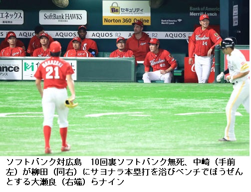 ソフトバンクが効率的に得点を奪い、逃げ切った。四回に西田のスクイズで先制。五回にはグラシアルがソロを放った。先発バンデンハークは球威があり6回無失点で10奪三振と好投し、継投も決まった。広島は安打数で相手を上回るも、序盤の2度の盗塁死が痛かった。