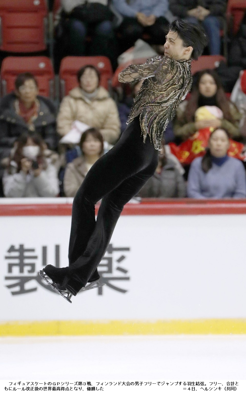 羽生は国際スケート連盟公認大会で初めて4回転トーループ―トリプルアクセル(3回転半ジャンプ)を着氷する高難度の演技構成を見せ、シニア転向9季目で初めてGP初戦を制した。