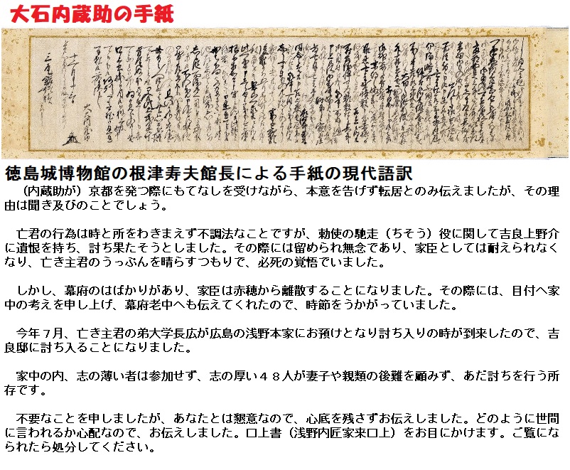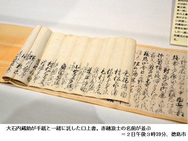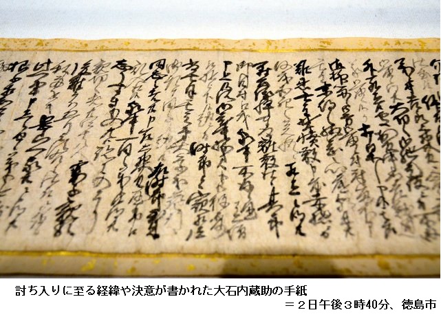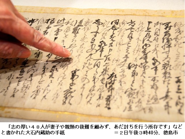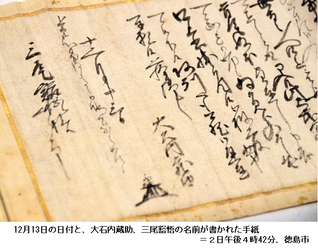 大石内蔵助の討ち入り前日の「遺書」、60年ぶりに公開 ―― 「忠臣蔵」で知られる赤穂浪士が吉良(きら)邸に討ち入った前日に、赤穂藩家老だった大石内蔵助(おおいしくらのすけ)が、徳島にゆかりのある親戚宛てに書いた手紙が現存していることが、徳島市立徳島城博物館の調査でわかった。討ち入りの決意や経緯がつづられた「遺書」とも言える内容で、同博物館で約60年ぶりに公開されている。