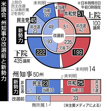 一方、トランプ氏は選挙結果を受け、六日夜のツイッターに「とてつもない成功だ」と投稿。七日朝にも投稿を連発し、「もし民主党が下院で納税者のお金を無駄な調査に使うなら、われわれは上院で彼らの極秘情報を調べることを考えざるを得ない。双方のゲームだ!」と挑発した。