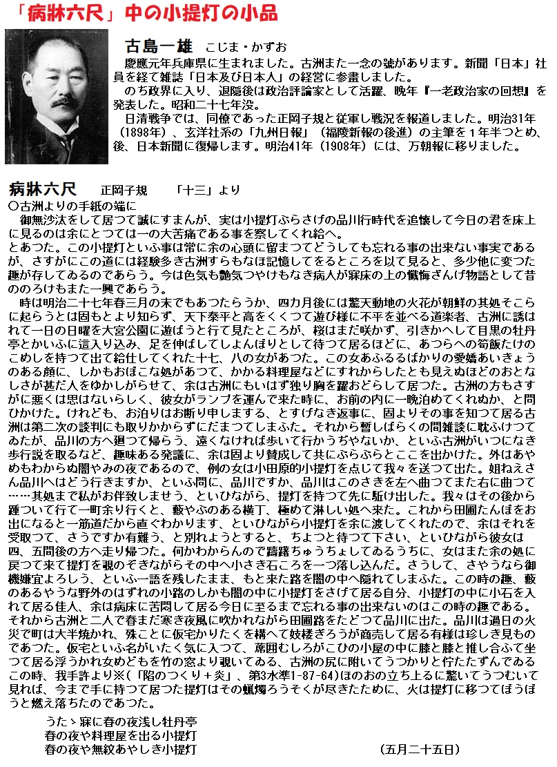 五 子規自身の小説には殆ほとんど見るに足るものなし。然れども子規を長生きせしめ、更に小説を作らしめん乎(か)、伊藤左千夫、長塚節等の諸家の下風に立つものにあらず。「墨汁一滴」や「病牀六尺」中に好箇の小品少からざるは既に人の知る所なるべし。就中(なかんづく)「病牀六尺」中の小提灯の小品の如きは何度読み返しても飽ざる心ちす。