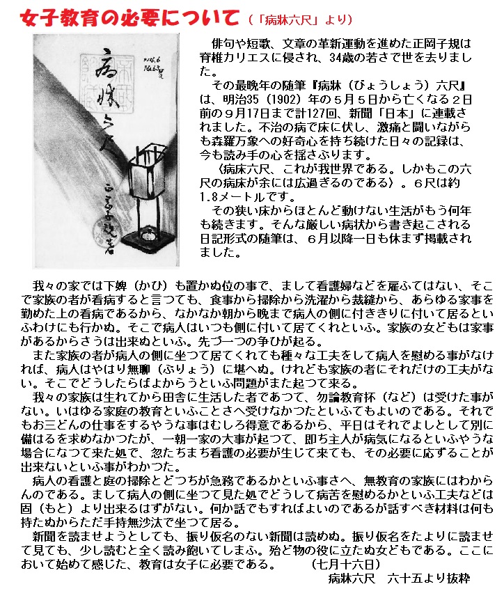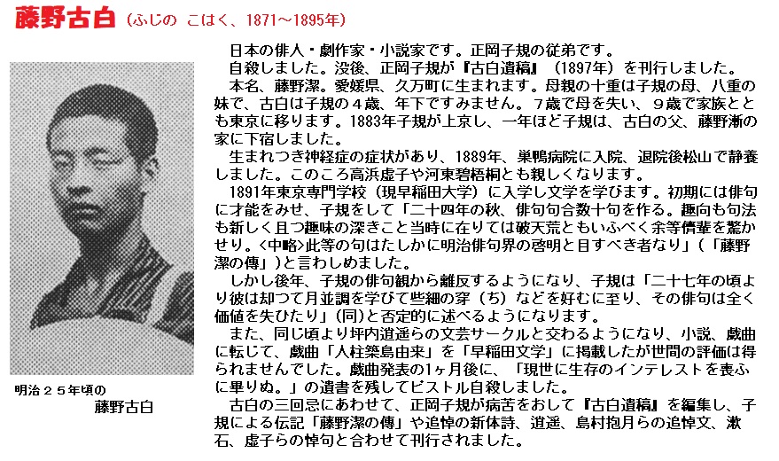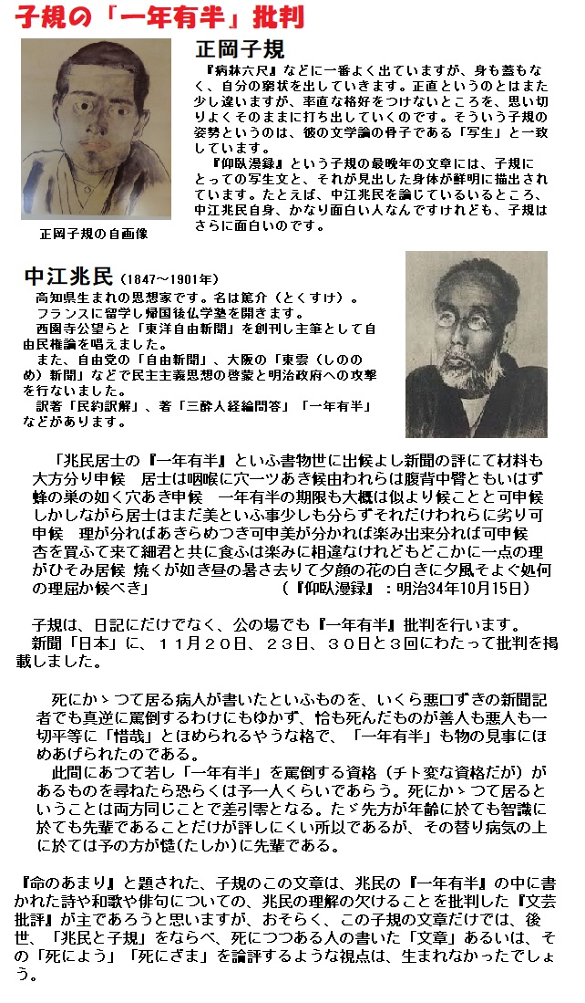 六 人としての子規を見るも、病苦に面して生悟(なまざとり)を衒(てら)はず、歎声を発したり、自殺したがつたりせるは当時の星菫(せいきん)詩人よりも数等近代人たるに近かるべし。その中江兆民の「一年有半(いうはん)」を評せる言の如き、今日これを見るも新たなるものあり。