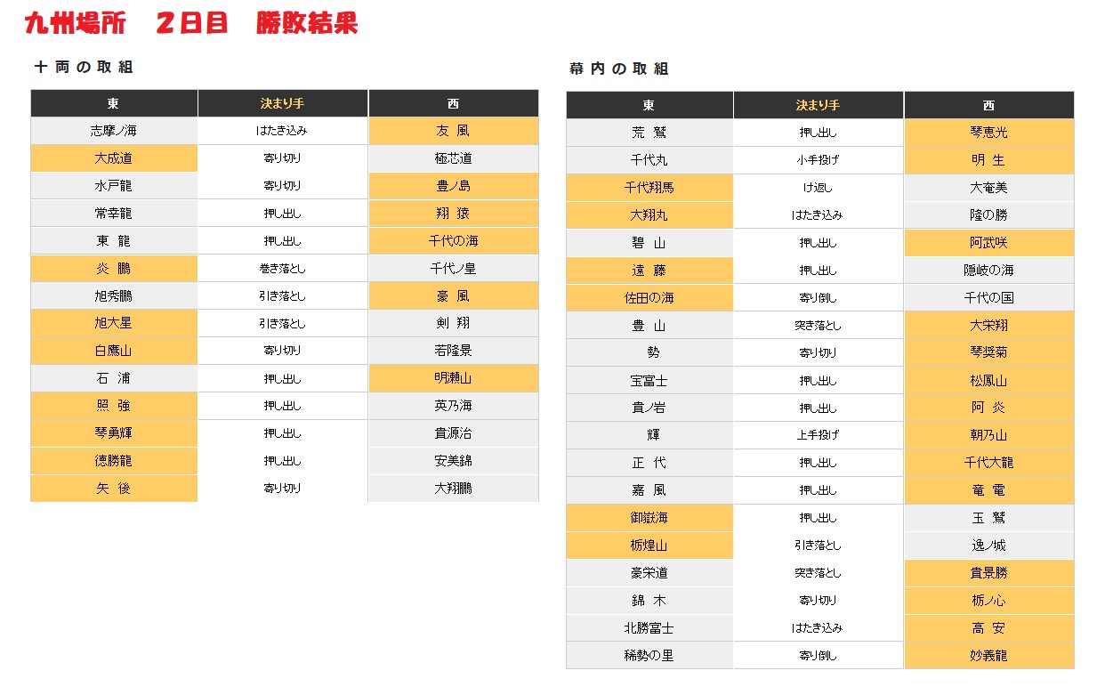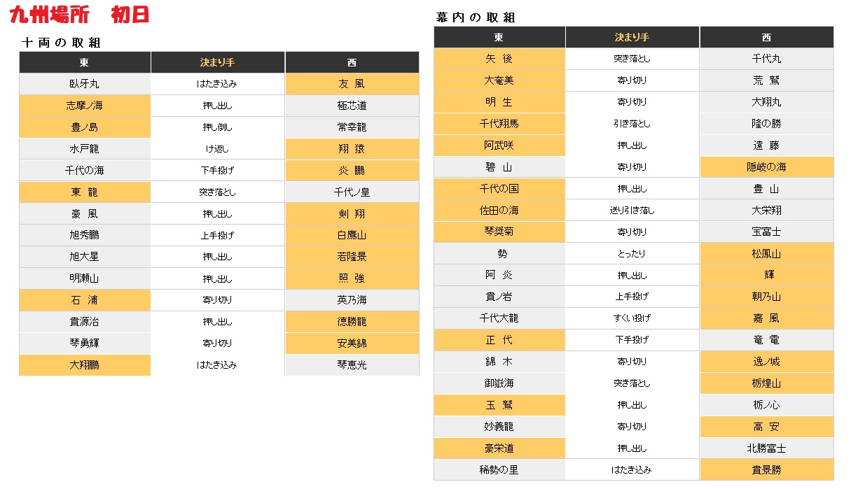 昨日から大相撲九州場所が始まりました。十両・幕内の初日の勝敗結果は次の通り。