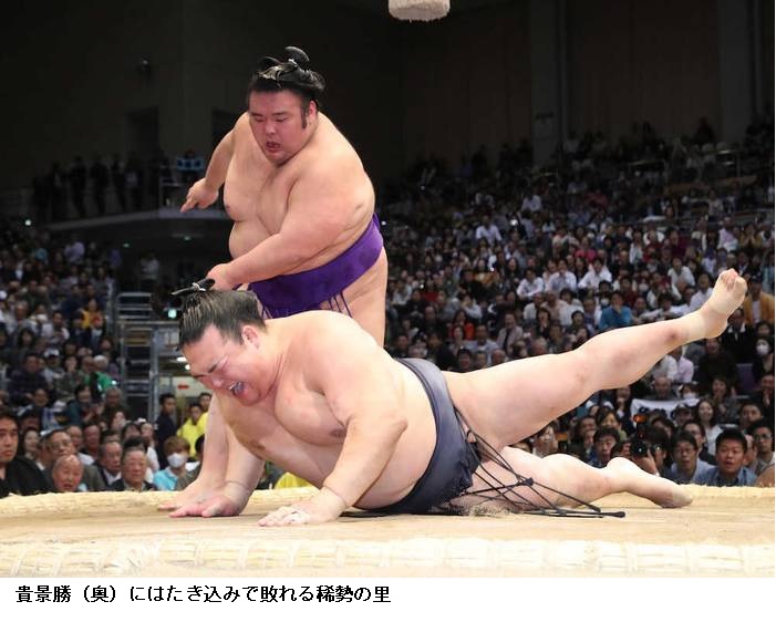 稀勢の里が連敗 横綱・大関陣で無敗は高安だけ ―― 一人横綱の稀勢の里は平幕の妙義龍に双差しから寄り倒されて2連敗。妙義龍は2013年夏場所以来、3個目の金星獲得。