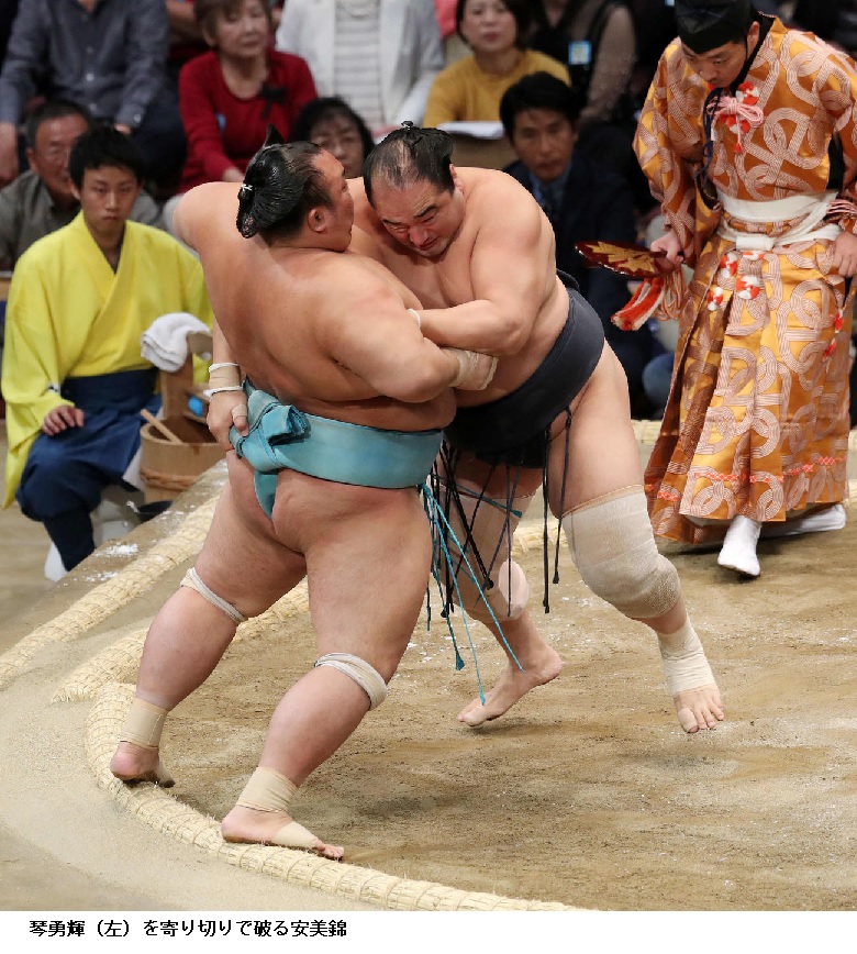 安美錦が40歳初白星、初土俵から21年喜び変わらず ―― 西十両2枚め安美錦(伊勢ケ浜)が、東十両3枚目琴勇輝(27=佐渡ケ嶽)を下して、40歳初白星を挙げた。