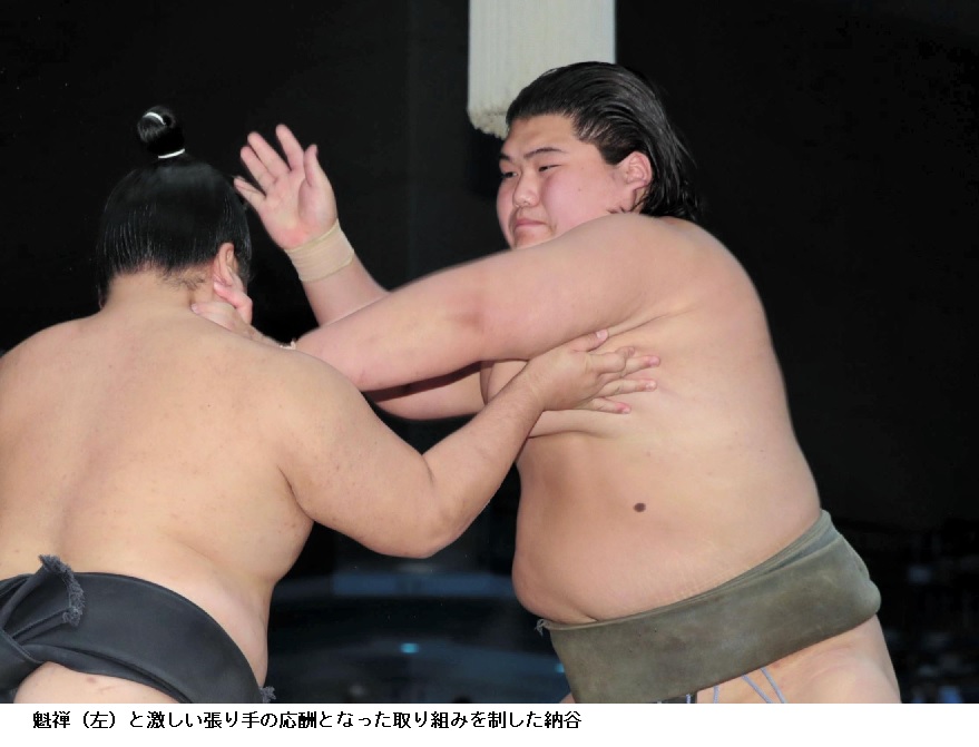 納谷が白星スタート、先場所負け越しから再出発 大鵬の孫「立ち合いから前に」 ―― “昭和の大横綱”大鵬(故人)の孫で元関脇貴闘力の三男、西三段目11枚目の納谷(18)=大嶽=が魁禅(浅香山)を押し出して下し、白星スタートを切った。立ち合いで圧力をかけ攻め込むと手数も出て押し切った。
