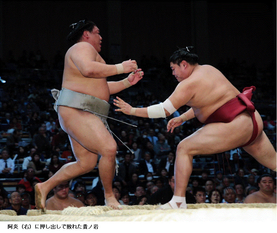 張り差しにいったが、阿炎が長い腕から繰り出したもろ手突きをまともに食らってまわしを取れず、押し出された。