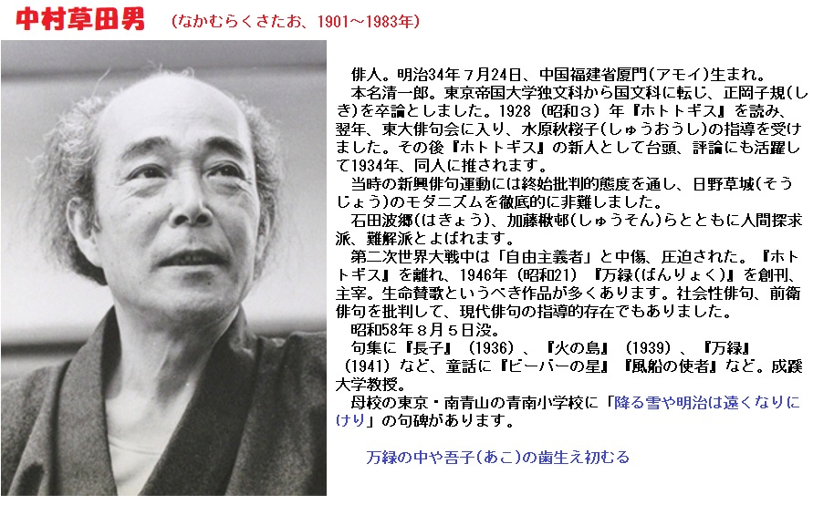 その後、「馬酔木」を辞した山口誓子が「天狼」を創刊。また「馬酔木」の中で秋桜子から「難解派」と呼ばれていた中村草田男らが「人間探求派」として独立しました。草田男は子規の「写生」を受け継ぎ深化させつつ、さらに人間の内面心理も詠むことを追求しました。