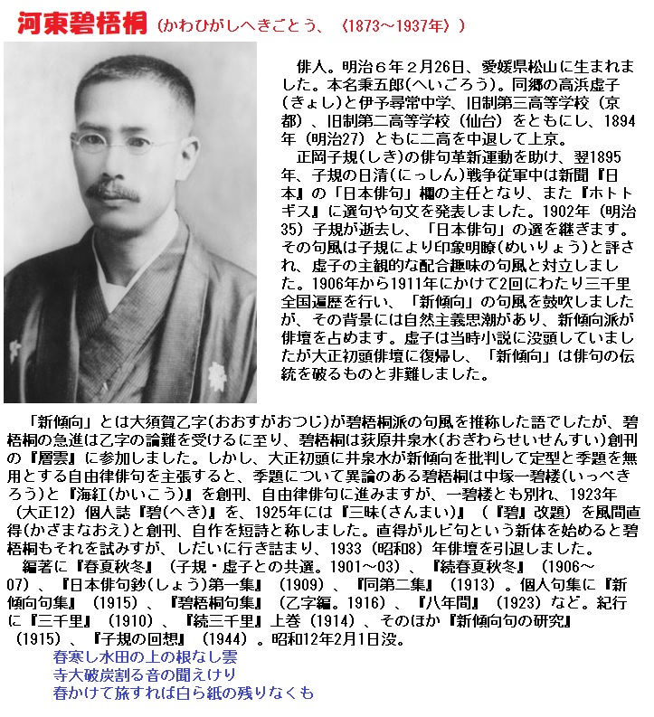碧梧桐は明治三十八年頃から自由律俳句誌『層雲』を主宰する荻原井泉水と共に句作活動を行うようになります。荻原は定型にとらわれない自由な韻律の句作を提唱。門下生には尾崎放哉、種田山頭火らがいます。