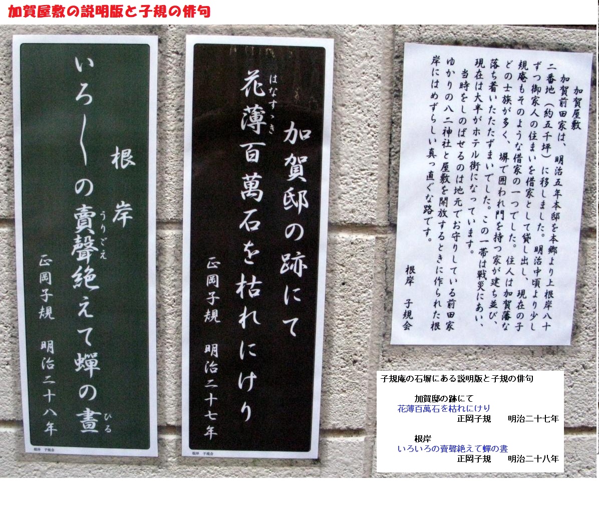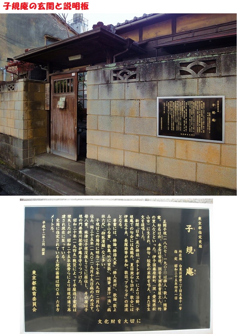 交通止めの標識のため、タクシーを降りて、路地を行くと、子規庵を見つけました。子規庵に沿うの石塀の先に説明版と子規の句が張り付けられています。