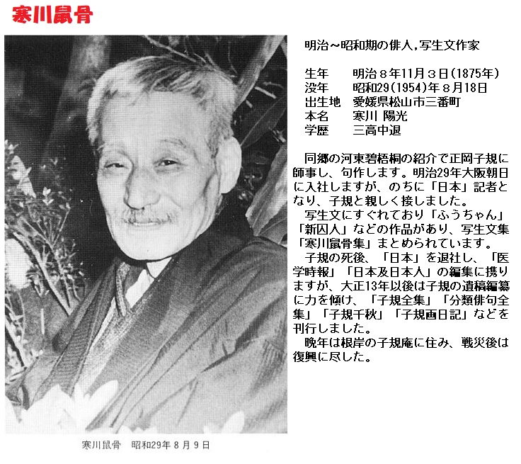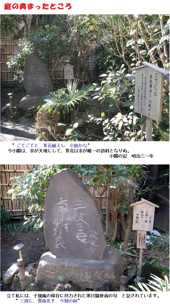 ”ごてごてと 草花植えし 小庭かな” と子規の俳句があり、さらに奥まったところには寒川鼠骨翁の句碑がありました。