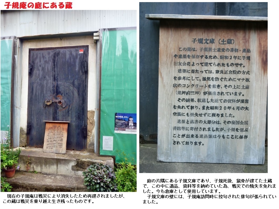 昭和2年、母八重(83歳)月没し、同年7月子規の遺品や遺墨等を保管するため土蔵(子規文庫)建設に着工します。