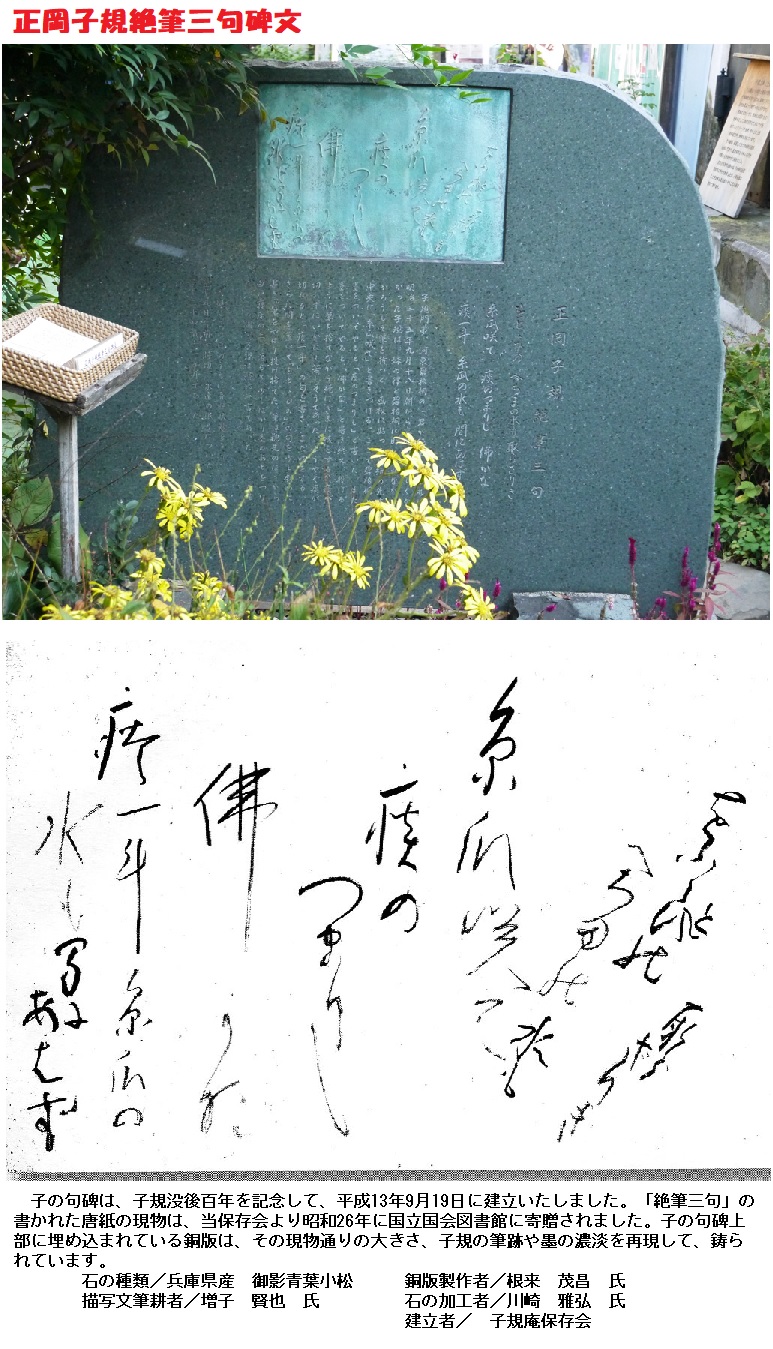 最後に、平成になって建てられた「子規絶筆三句」の碑文がありました。