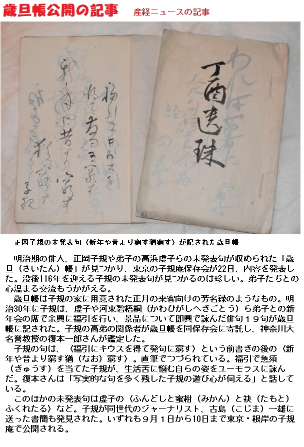 新発見の「歳旦帳」は9月がつ1日から30日までこの子規庵で開かれた「糸瓜忌特別展」で展示されいました。4日ほど遅れて残念でしたが、まあ他に客のいない空いた子規庵を見学できたのは幸いだったと思いましょう。
