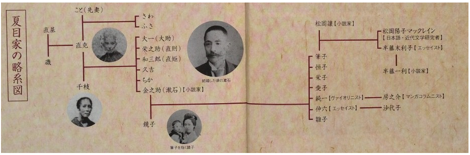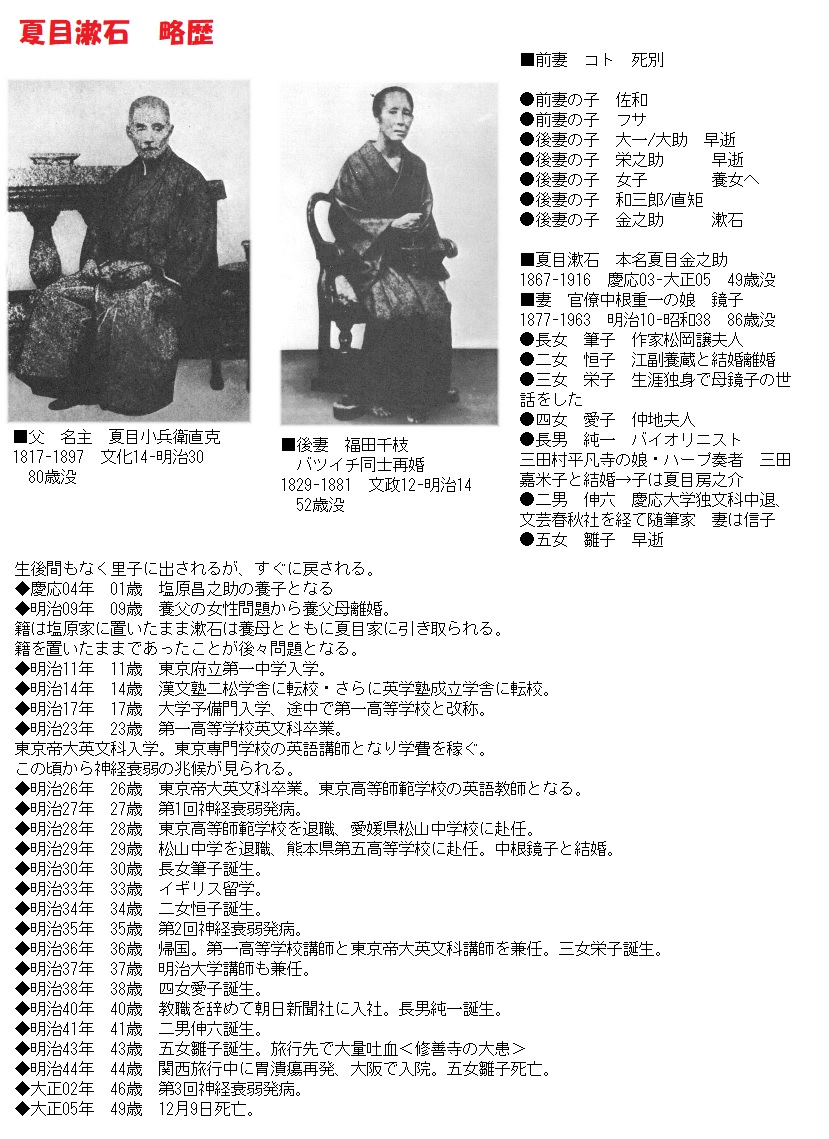 父、夏目小兵衛直克は牛込から高田馬場一帯を治めている名主で、家はかなり裕福でした。しかし、明治維新によって名主が没落しつつあったためか、すぐに里子に出されます。その後、連れ戻されるも、一歳の頃に養子に出され、養父母の離婚が原因で生家に戻るなど、家庭環境はかなりゴタゴタしていました。