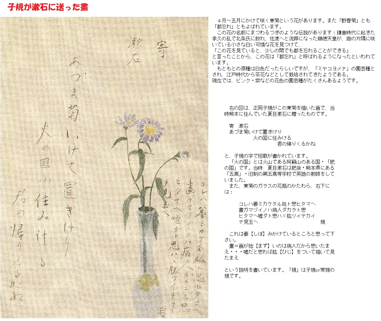 漱石は翌年、松山を去った子規に、このような別れの句を送っています。