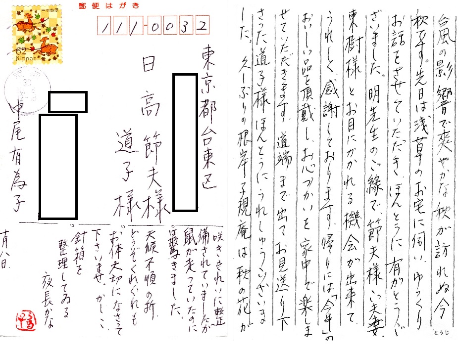 中尾有為子さんから、先日の礼状が届きました。