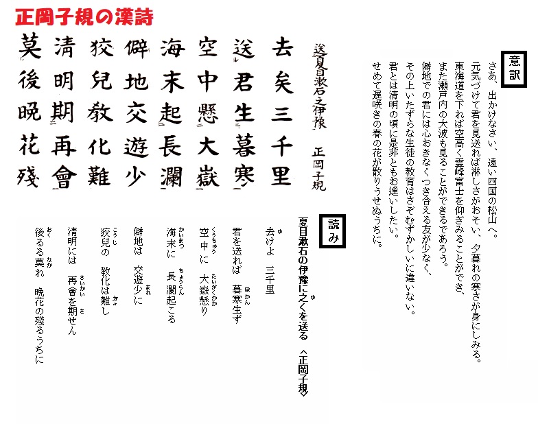 又正岡はそれより前漢詩を遣(や)っていた。それから一六風か何かの書体を書いていた。其頃僕も詩や漢文を遣っていたので、大に彼の一粲(いっさん)を博した。僕が彼に知られたのはこれが初めであった。或時僕が房州に行った時の紀行文を漢文で書いて其中に下らない詩などを入れて置いた、それを見せた事がある。処が大将頼みもしないのに跋(ばつ)を書いてよこした。何でも其中に、英書を読む者は漢籍が出来ず、漢籍の出来るものは英書は読めん、我兄の如きは千万人中の一人なりとか何とか書いて居った。処が其大将の漢文たるや甚(はなは)だまずいもので、新聞の論説の仮名を抜いた様なものであった。けれども詩になると彼は僕よりも沢山(たくさん)作って居り平仄(ひょうそく)も沢山たくさん知って居る。僕のは整わんが、彼のは整って居る。漢文は僕の方に自信があったが、詩は彼の方が旨(うま)かった。尤(もっと)も今から見たらまずい詩ではあろうが、先(ま)ず其時分の程度で纏(まと)まったものを作って居ったらしい。たしか内藤さんと一緒に始終(しじゅう)やって居たかと聞いている。