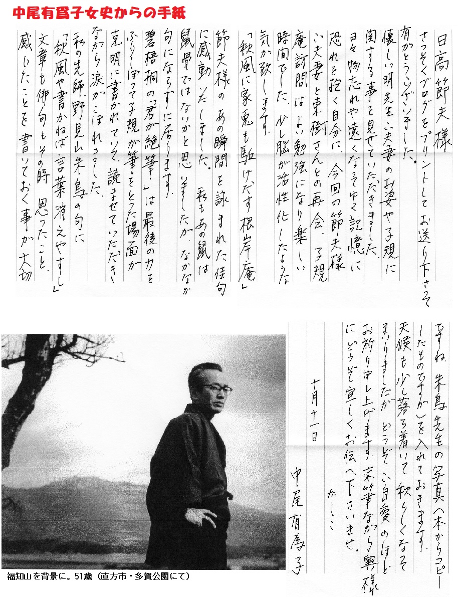 10月9日(火)に、中尾有爲子女史に訪問の礼状を送りました。曰く、