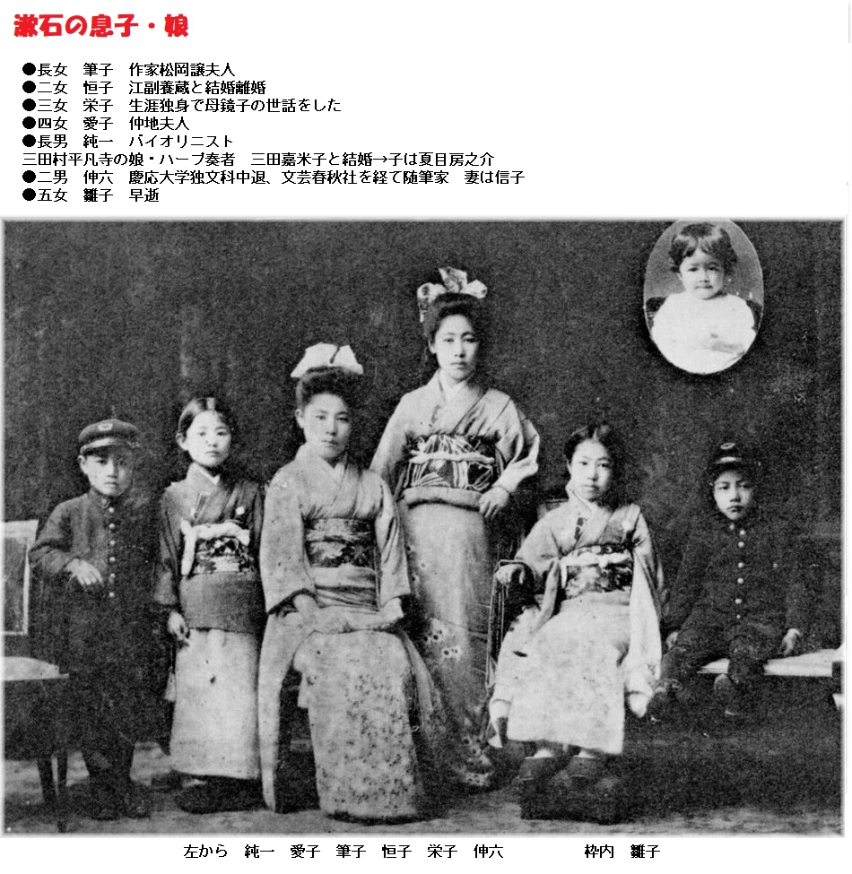 漱石は2男5女の子宝に恵まれましたが、子供たちはかんしゃく持ちの父親を怖がってあまり懐かなかったようです。