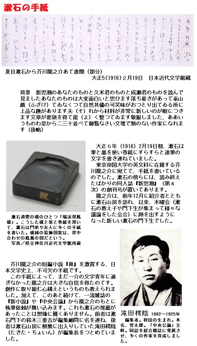 芥川龍之介は「夏目さんは私の知っている限りの誰よりも江戸っ子でした」と語っています。人情に厚く、人の世話をしたり、弟子を集めるのが好きだったようです。漱石は、芥川龍之介の小説『鼻』を「「あなたのものは大変大変面白いと思います。落ち着きがあって巫山戯ていなくって自然そのままの可笑味がおっとり出ている所に上品な趣味があります」と手紙で褒めています。芥川龍之介はこれを大変喜んだそうです。