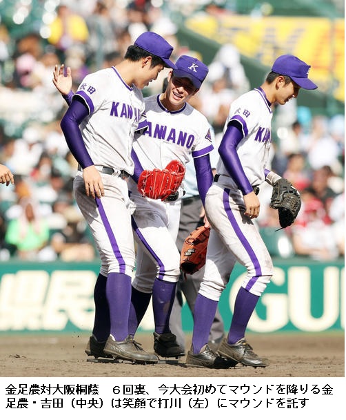 秋田大会から一切交代なしで戦ってきた金足農を支える大黒柱・吉田は5回132球12失点で降板。6回からは吉田に代わって打川が今夏初めて登板するなど、最後まで全力を尽くして食らいついたが王者・大阪桐蔭の底力に屈した。