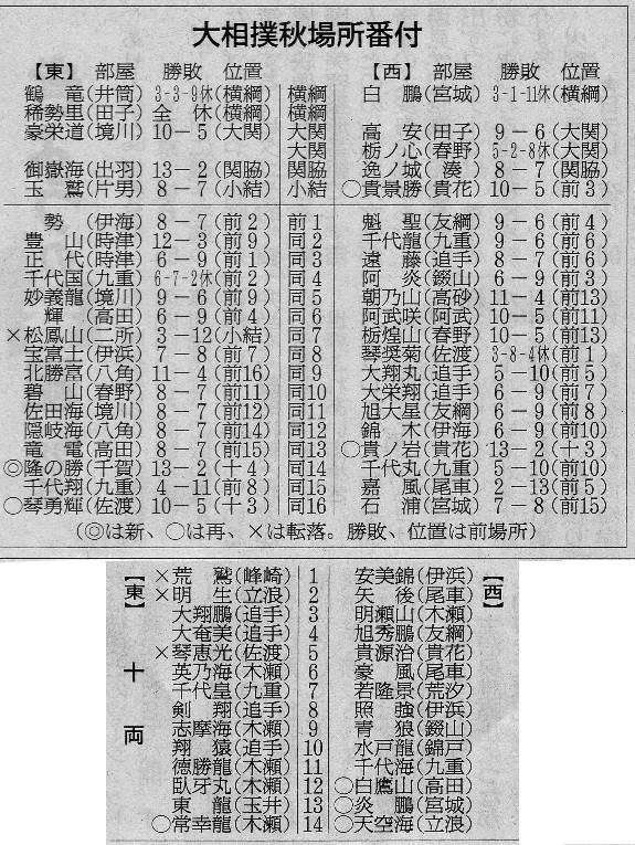8場所連続休場中で秋場所の出場を明言している横綱稀勢の里は東の2番手から復活を期す。貴乃花部屋の貴ノ岩は元横綱日馬富士による傷害事件のけがから復帰後初めて、昨年九州場所以来の幕内復帰。千葉県出身の23歳、隆の勝が新入幕を果たした。大関2場所目の栃ノ心は初のカド番。 (朝日新聞DIGITAL 2018年8月27日06時00分)