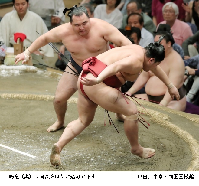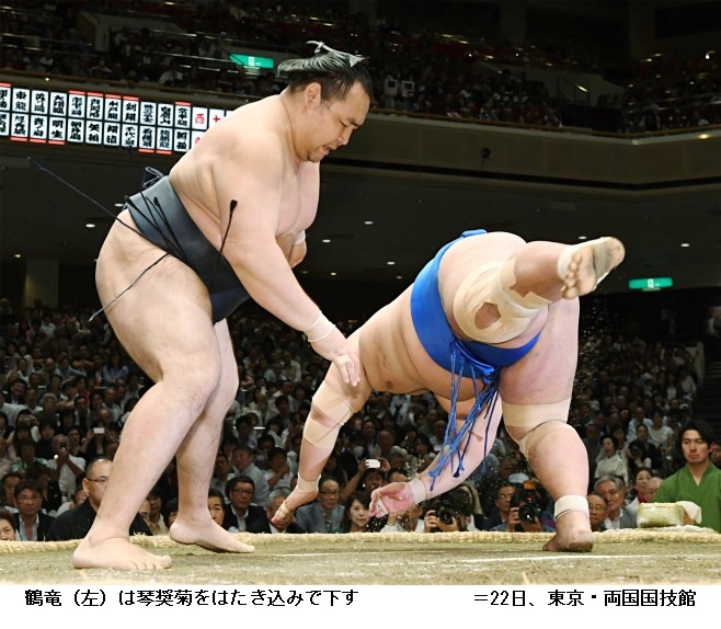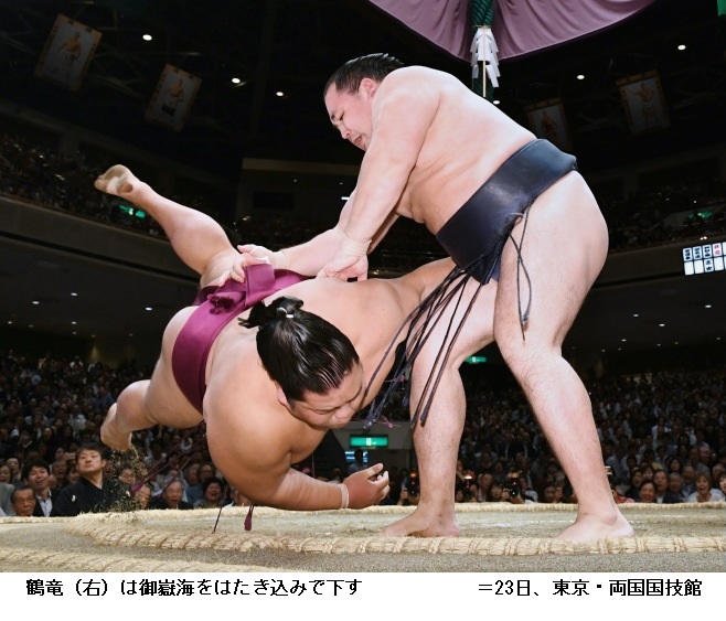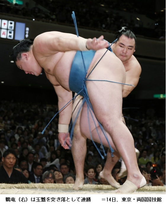 御嶽海に土俵際まで追い詰められたものの、逆転で10勝目をあげた横綱・鶴竜は「絶対引かないと頭に入れて相撲を取った。最後きれいに体が回ってよく動けたと思う。きょうは終わったのであしたの相撲に集中するだけです」と話していました。 (NHK NEWS WEB 5月24日 0時11分)