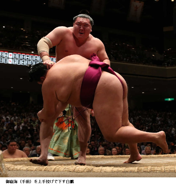 横綱 白鵬に御嶽海は、白鵬が上手投げで勝って2連勝です。