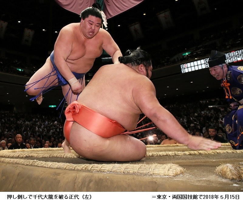 千代大龍に正代は正代が押し倒し。