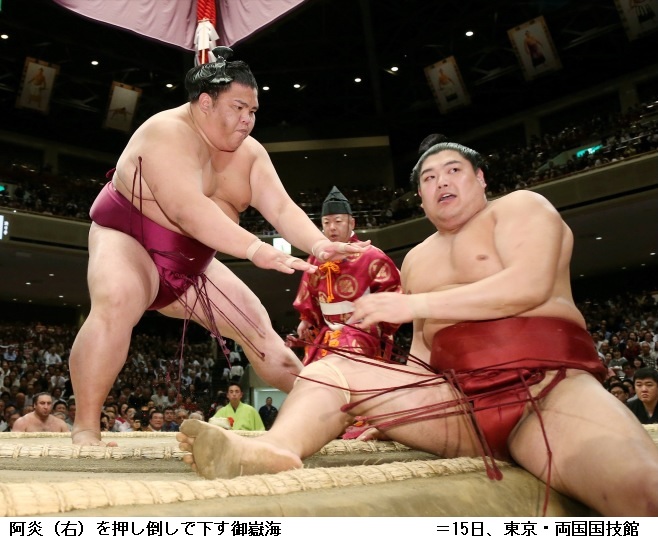 御嶽海に阿炎は御嶽海が押し倒し。