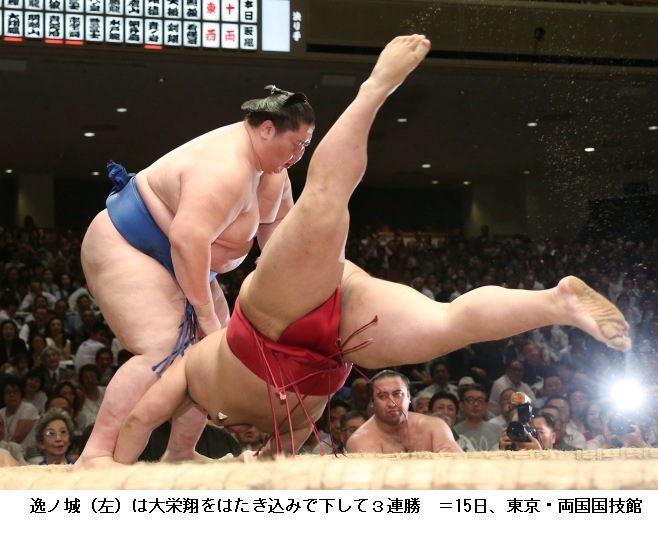 大栄翔に逸ノ城は物言いがつくきわどい相撲になりましたが、逸ノ城がはたき込みで勝って3連勝。