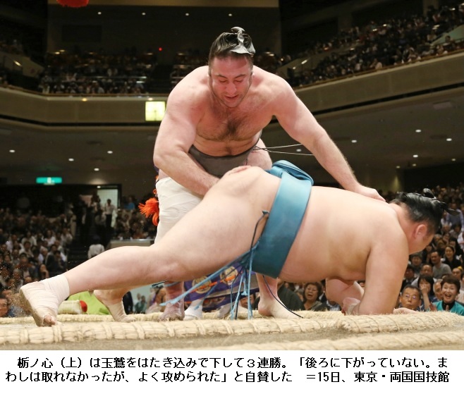 大相撲夏場所3日目 栃ノ心が初日から3連勝 ―― 大相撲夏場所は、東京 両国の国技館で3日目の取組が行われ、大関昇進を目指す栃ノ心は実力者の玉鷲を破って3連勝としました。